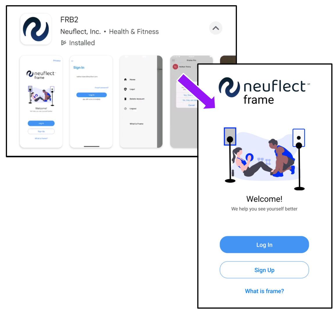 The app name may appear differently depending on your device. On Apple, search the App Store for "FRB1". On Android, search the Google Play Store for "FRB2". In both stores, look for the Neuflect logo to ensure you have the right one.